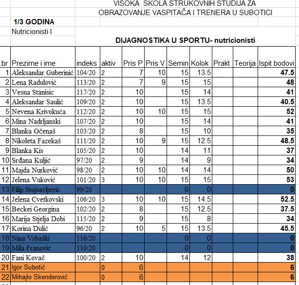 У прилогу се налазе остварени поени у оквиру предмета и предиспитних обавеза, као предуслов за излазак на испит у јануарском року. Обележени студенти не могу приступити испиту у јануарском року зато што нису на време одрадили предиспитне обавезе.
