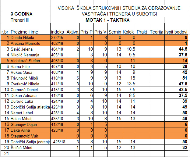 У прилогу се налазе остварени поени у оквиру предмета и предиспитних обавеза, као предуслов за излазак на испит у јануарском року. Обележени студенти не могу приступити испиту у јануарском року зато што нису на време одрадили предиспитне обавезе.