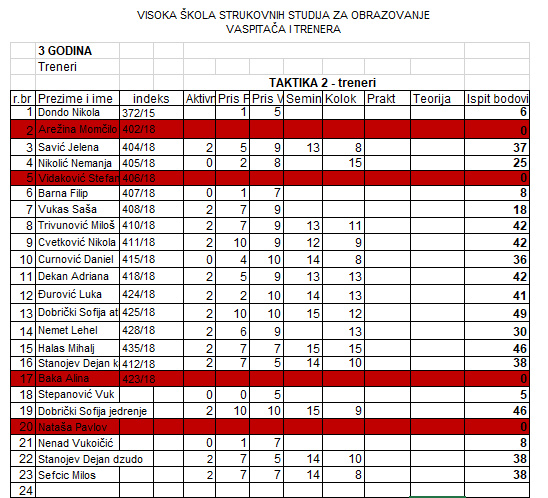 У ПРИЛОГУ ЈЕ ТАБЕЛА ОСТВАРЕНИХ ПОЕНА СВИХ ПРЕДИСПИТНИХ ОБАВЕЗА У ТОКУ СЕМЕСТРА